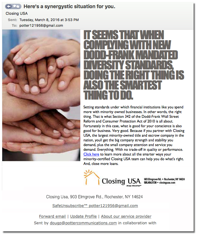 This HTML email was the second of four promoting Closing USA as the minority-owned partner to rely on to enable large financial institutions to comply with the Dodd Frank dicersity and inclusion mandates without fear of a drop in service or quality.