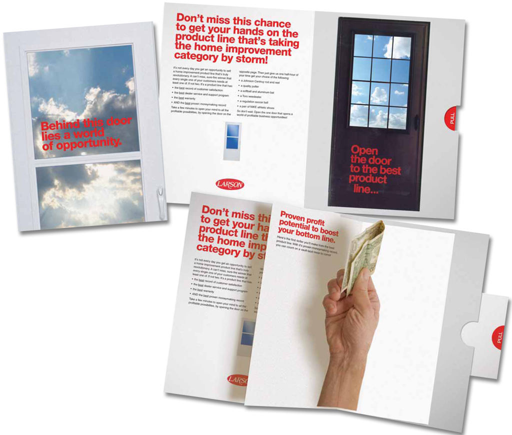 This pop-up 3D direct mail brochure was the second piece in a two-part mailing seriesĀ to home improvement store dealers in the greater Kansas City market. The hook in the piece was an actual $1 bill in a pop-up hand, the first dollar they would make selling Larson Storm Doors. The incentive to schedule a meeting with the Larson Storm Doors Market Penetration Teams was a choice of a wider selection of sporting equipment. Together with the previous 3D teaser piece, both mailed to 311 dealers, the campaign generated an whopping 97% response rate, resulting in 302 meetings, and ultimately, 287 signed dealers. The client said this shortened market penetration from 5 years to 3 months, and more than tripled the dealer total they reasonably could have expected. Together with the consumer TV and newspaper insert that generated a 28% market share from nothing in the first year, this effort won a Gold Effie for marketing effectiveness.