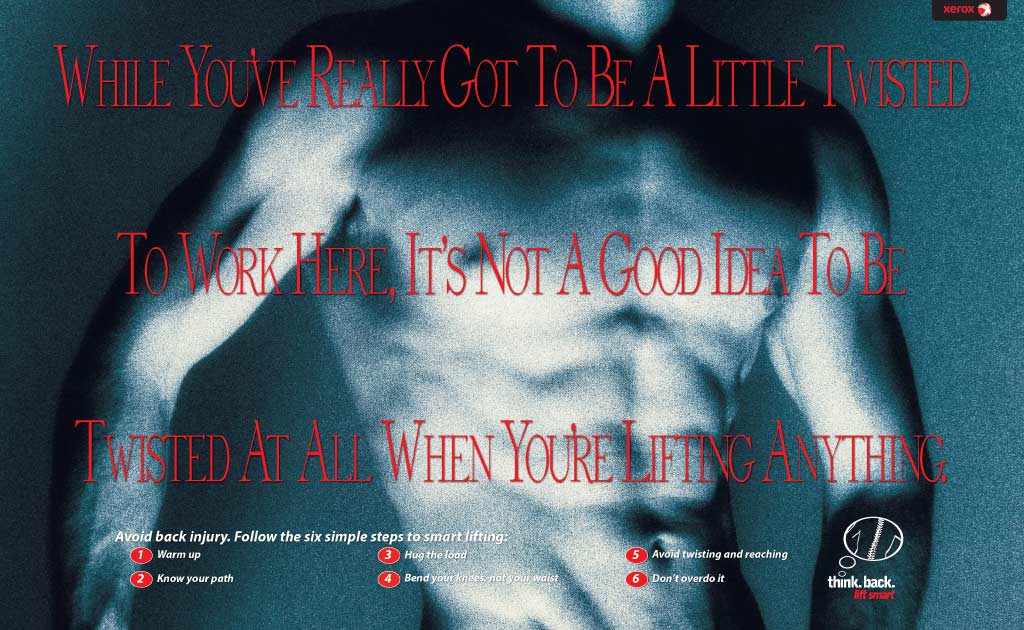 This 2′ x 3′ poster was a key element in an internal campaign at all Xerox facilities to reduce the incidence of back injuries, which had become an epidemic company-wide, mainky due to people lifting 25-50 lb. boxes of copier paper incorrectly. The program resulted in a 42